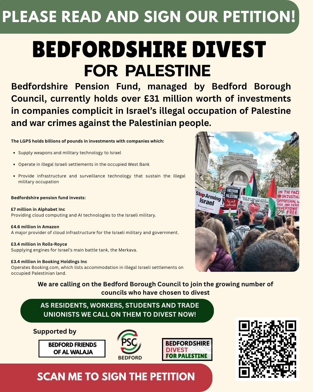 We are calling on the Bedford Borough Council to join the growing number of councils who have chosen to divest from these companies who are complicit in the Palestinian Genocide.